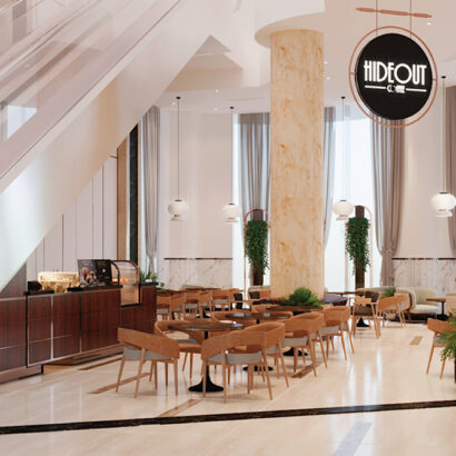 Tọa lạc tại sảnh tầng 1 của khách sạn, không gian Hideout café thực sự là địa điểm lý tưởng cho những phút giây thư giãn bên những người thân và bè bạn. Một ly café với hương vị thân quen cùng với những loại bánh thơm ngon thượng hạng do đầu bếp đẳng cấp năm sao tận tâm phục vụ.