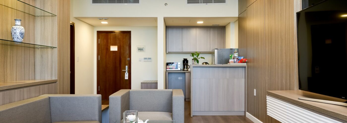 Có diện tích lên đến 58m2 bao gồm phòng khách và phòng ngủ có tầm nhìn trực diện bãi biển Mỹ Khê trong xanh, Suite Ocean với thiết kế trang nhã là lựa chọn tuyệt vời cho bất kỳ ai đang tìm kiếm địa điểm nghỉ ngơi kết hợp chuyến công tác dài ngày. Ngoài ra, căn bếp với đầy đủ trang thiết bị cao cấp sẽ mang đến cho bạn một không gian sống thoải mái nhất.