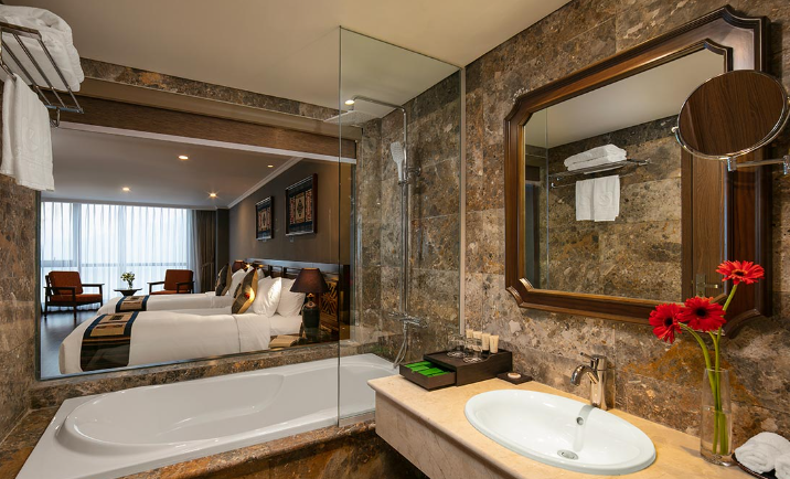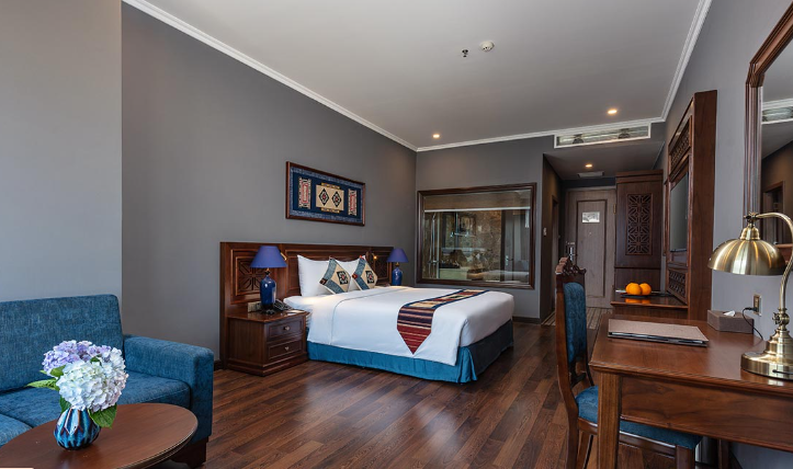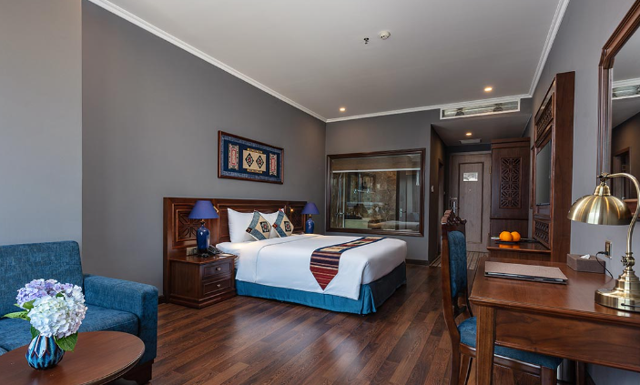 Sở hữu diện tích 38m2, phòng Superior hướng thị xã ấm cúng nhưng không kém phần trang nhã với 1 giường lớn, ghế sofa phòng khách, tivi, bàn làm việc kết hợp trang điểm, tủ quần áo, phòng tắm hiện đại.