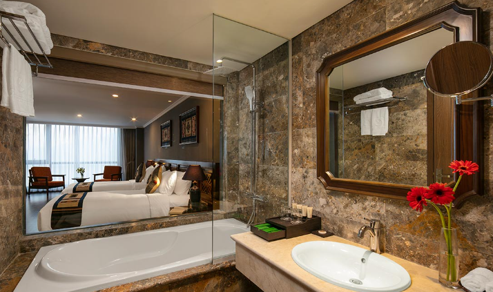 Nằm từ 5 đến tầng 8 của khách sạn, toàn bộ các phòng Deluxe đều có ban công riêng với tầm nhìn hướng núi. Phòng có diện tích 38m2 với thiết kế hiện đại kết hợp những nét truyền thống cùng hệ thống tiện nghi đạt chuẩn 4 sao.