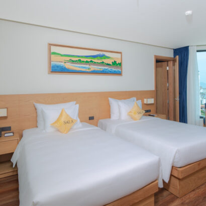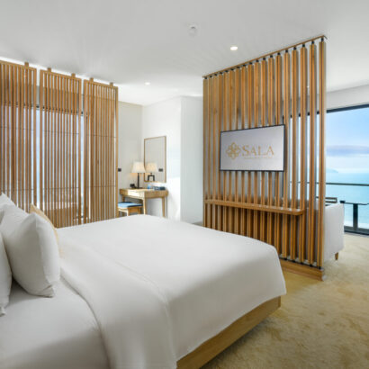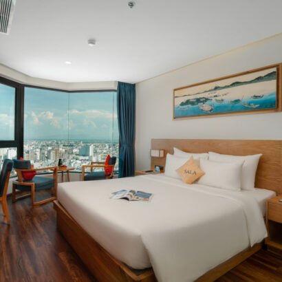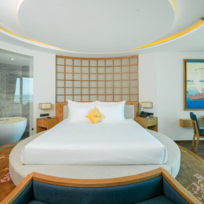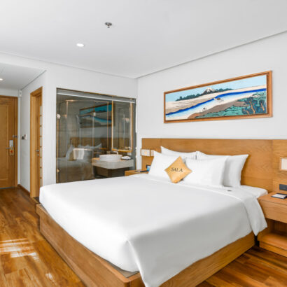 Phòng Sala Suite luôn là lựa chọn hàng đầu dành cho các cặp đôi hưởng tuần trăng mật hay những ngày kỉ niệm. Với bồn tắm tròn lớn nhìn ra góc phố biển Mỹ Khê cho không gian thêm ngọt ngào, giường King size được nâng cao hơn sàn với thiết kế độc đáo như những vòng tay quấn quýt bên nhau.