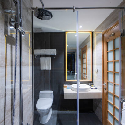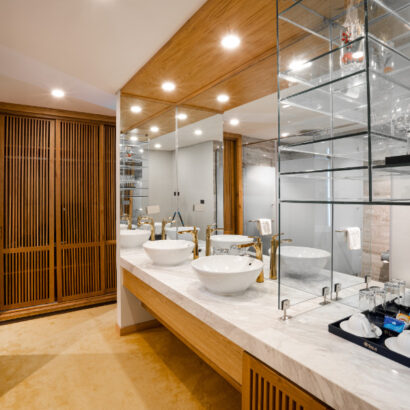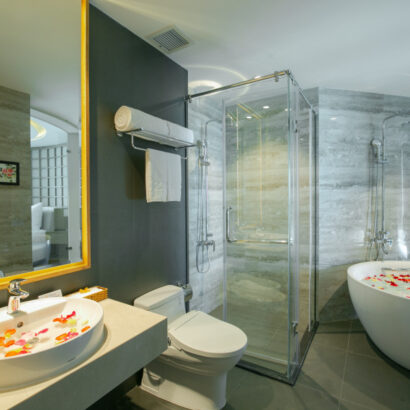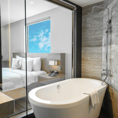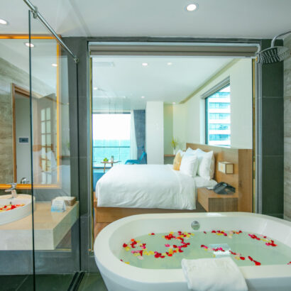 Sóng vỗ rì rào ngay dưới chân mình buổi sớm mai sẽ giúp bạn thức dậy căng tràn hương vị của biển, hay ngâm mình trong bồn tắm thả trôi những tất bật cuộc sống và ngắm nhìn cả thành phố thu gọn bên ô cửa với căn Premium Suite.