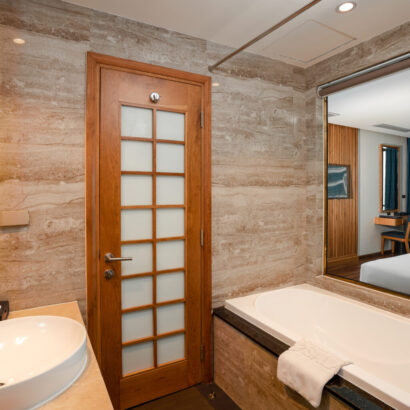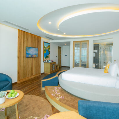 Với phòng Suite Partial Sea View, những tia nắng ấm cùng biển xanh không chỉ được ngắm nhìn từ ban công mà còn tại ngay cạnh đầu giường, sẽ cho bạn cảm giác như được biển ôm vào lòng. Phòng được trang bị bồn tắm lớn vừa có thể mang đến sự lãng mạn cho các cặp đôi, vừa có đủ không gian vui đùa cho các gia đình nhỏ.